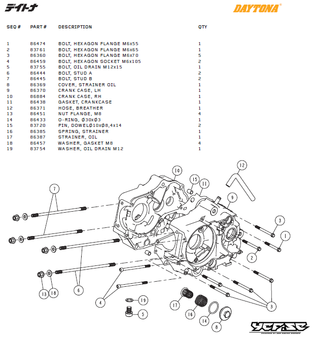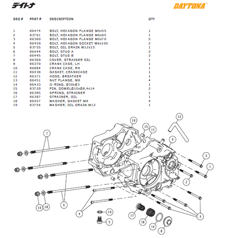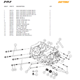 Motorblock delar till Daytona ANIMA®150/190 (4 VALVES). 1 Artikel=1 del Daytona Artikelnummer # 1= 86474 BOLT, HEXAGON FLANGE M6x55 2= 83761 BOLT, HEXAGON FLANGE M6x65 3= 86360 BOLT, HEXAGON FLANGE M6x70 4= 86459 BOLT, HEXAGON SOCKET M6x105 5= 83755 …