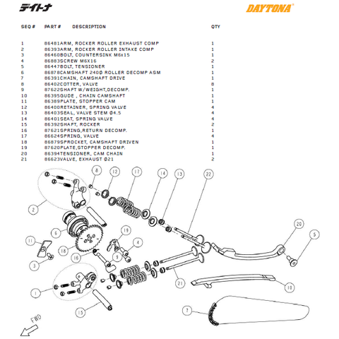 Ventilmekanism delar till Daytona ANIMA®150/190 (4 VALVES). 1 Artikel=1 del Daytona Artikelnummer # 1= 86481 ARM, ROCKER ROLLER EXHAUST COMP 2= 86393 ARM, ROCKER ROLLER INTAKE COMP 3= 86460 BOLT, COUNTERSINK M6x15 4= 86883 SCREW M6X16 5= 86447 BOLT, …