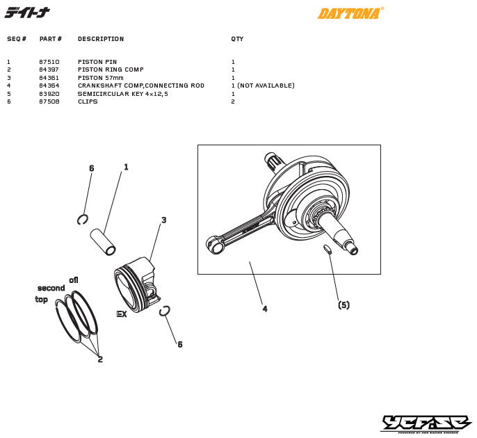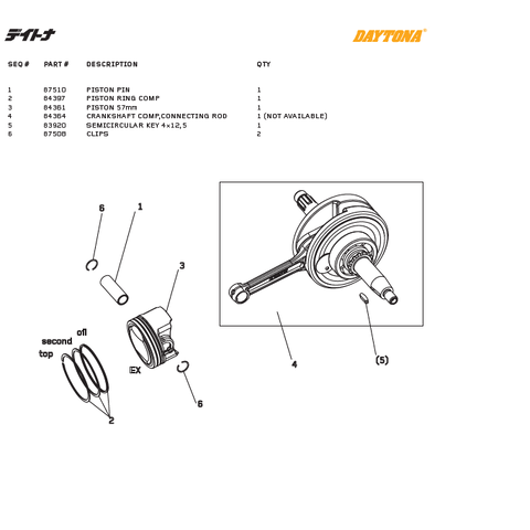 Kolv & vevaxel delar till Daytona DT 150cc, T-Rex (2 VALVES). 1 Artikel=1 del Daytona Artikelnummer # 1= 87510 PISTON PIN 2= 84397 PISTON RING COMP 3= 84361 PISTON 57mm 4= 84364 CRANKSHAFT COMP,CONNECTING ROD 1 (NOT AVAILABLE) 5= 83920 SEMICIRCULAR …