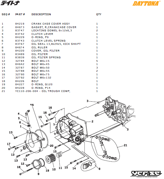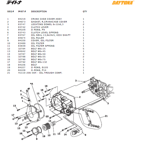 Kopplingskåpa delar till Daytona DT 150cc, T-Rex (2 VALVES).1 Artikel=1 delDaytona Artikelnummer # 1= 84219 CRANK CASE COVER ASSY 2= 84673 GASKET, R,CRANKCASE COVER 3= 83747 LOCATING DOWEL 8×12x6,3 4= 83742 CLUTCH LEVER 5= 84229 O-RING, P9 6= 83743 …