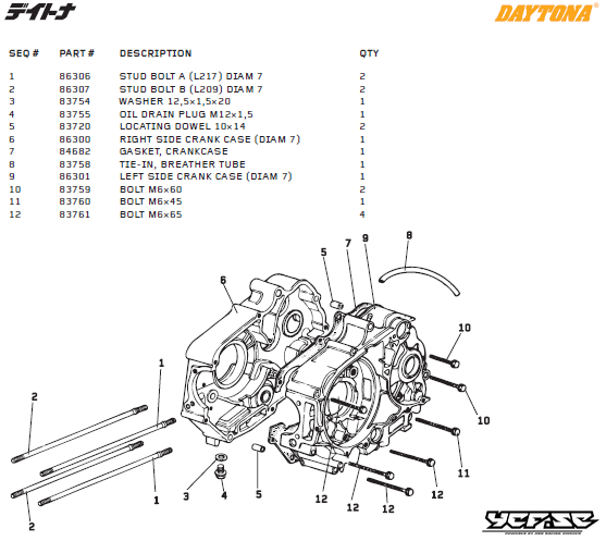 Motorblock delar till Daytona DT 150cc, T-Rex (2 VALVES).1 Artikel=1 delDaytona Artikelnummer # 1= 86306 STUD BOLT A (L217) DIAM 7 2= 86307 STUD BOLT B (L209) DIAM 7 3= 83754 WASHER 12,5×1,5×20 4= 83755 OIL DRAIN PLUG M12×1,5 5= 83720 LOCATING …