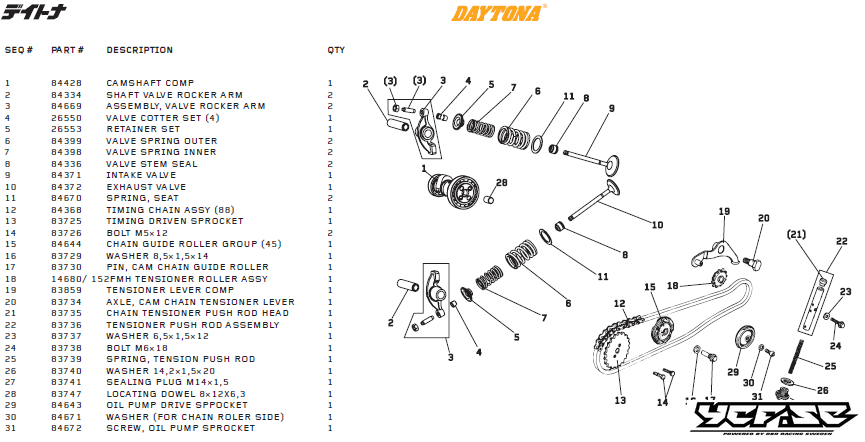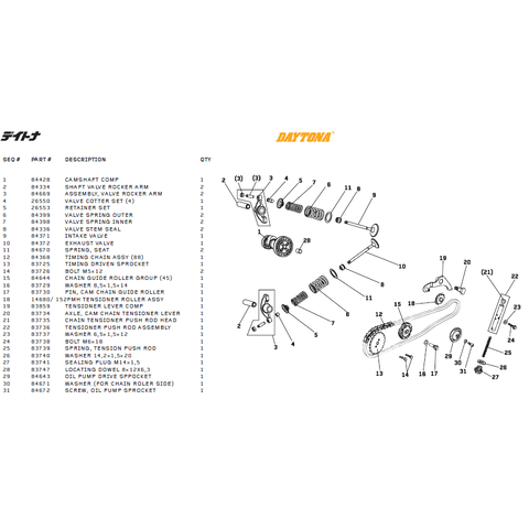 Ventilmekanism delar till Daytona DT 150cc, T-Rex (2 VALVES). 1 Artikel=1 del Daytona Artikelnummer # 1= 84428 CAMSHAFT COMP 2= 84334 SHAFT VALVE ROCKER ARM 3= 84669 ASSEMBLY, VALVE ROCKER ARM 4= 26550 VALVE COTTER SET (4) 5= 26553 RETAINER SET 6= …